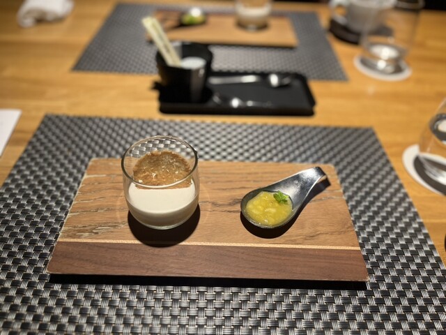 コースが始まる前のアペリティフタイムにも参加させて頂きました。こちらは、食前酒とともにシェフとお話しが出来る時間になっていて、これから頂く食材の話しや、越後湯沢の美味しいご飯についてなど幅広く楽しい話で弾みました。