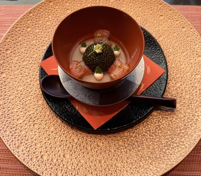 そばがきの風味、キャビアの塩味、ウォッカクリーム、海老、昆布、山葵等、全てが調和し最高の一品になっていた