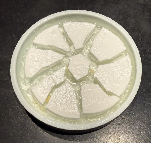水のゼリーの上にアーモンドのメレンゲが浮いている