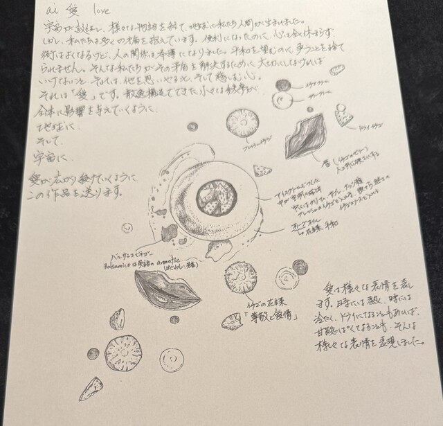 シェフからの熱い手書きの説明から始まり、アイスの空洞へ熱いソースをかけ崩しながら食べる一品