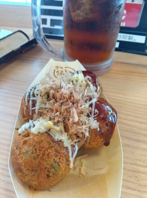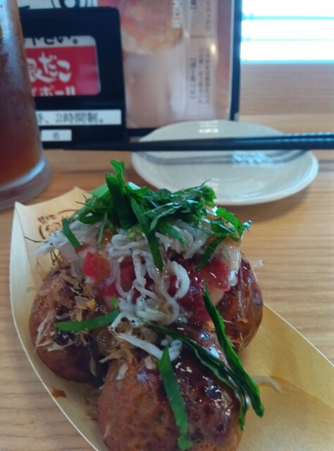 今日は定番のたこ焼き4個、カリカリ梅とシラスのたこ焼き、とり皮をツマミに、ウーロンハイ飲んてました。私オススメなのがカリカリ梅とシラスのたこ焼きです。このメニューは、店舗限定メニューで、テイクアウト出来ないものですが、たこ焼きの上に大根おろし、カリカリ梅、シラス、大葉の千切りが乗ってます。さっぱりとしていてとても美味しくいただきました。