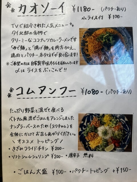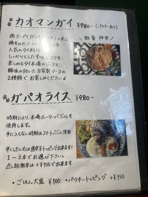 道挟んで目の前が有料パーキングになっていて便利になりました!ゆっくり食べてたけど300円でした️前も食べたカオソーイ¥1180円優しいカレー味のココナッツ風味麺と揚げた麺が美味しい!勿論追いパクチーで頂きました!ソムタム¥380(青パパイヤサラダ)体にも良いし青パパイヤの食感もすき!少し辛いです友人はエビガパオライス¥1180円味見したけどこちらも美味しい!満足なランチタイムでした✨