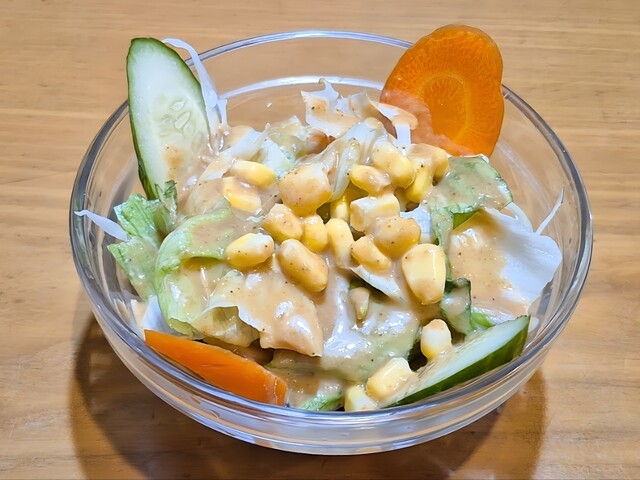 セットに付くサラダは、コーンなど具材の種類が多く、量も多め。