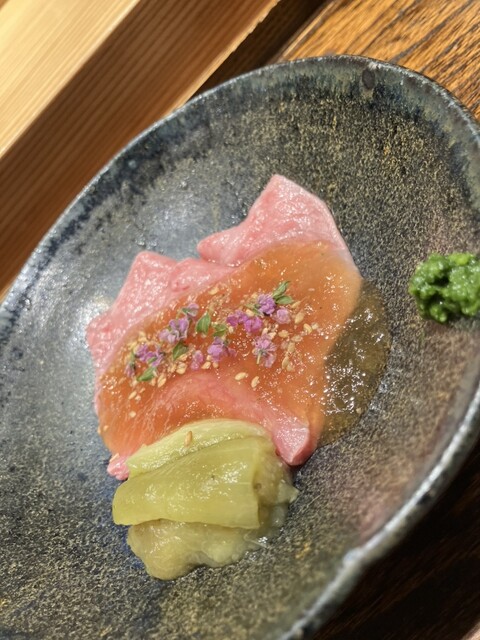 続いて二品目はリブロースとヒレの刺身が登場。光り輝くそのビジュアルはすでに圧倒的な存在感を放っている。まずはリブロースから。醤油に漬け込んであり、わさびで頂く。生肉とは思えない甘さの余韻を残してゆっくりと口の中で溶けていく。控えめに言っても最高である。ヒレは少し炙って塩とマスタードが添えてある。こちらも絶品である。