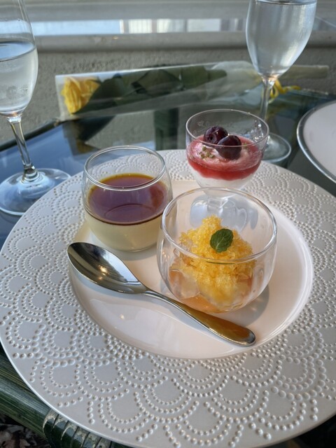 お食事後に別室のサロンに移動してデザートをいただけます。季節ごとに変わる全種類のデザートをトレーに乗せたサンプルを見て選ぶ瞬間は、いつもとても幸せな気持ちになります。