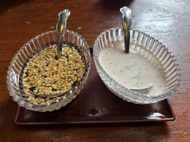 温かいおしぼりと温かい緑茶、山盛りのグリーンサラダに二種類の手作りドレッシングが運ばれてきました。ドレッシングは醤油ベースのピーナッツが入ったドレッシングと牛乳を用いて作られたサラサラしたドレッシングでした。私は二つを混ぜて頂きましたが、この食べ方がとても美味しく感じたのです。