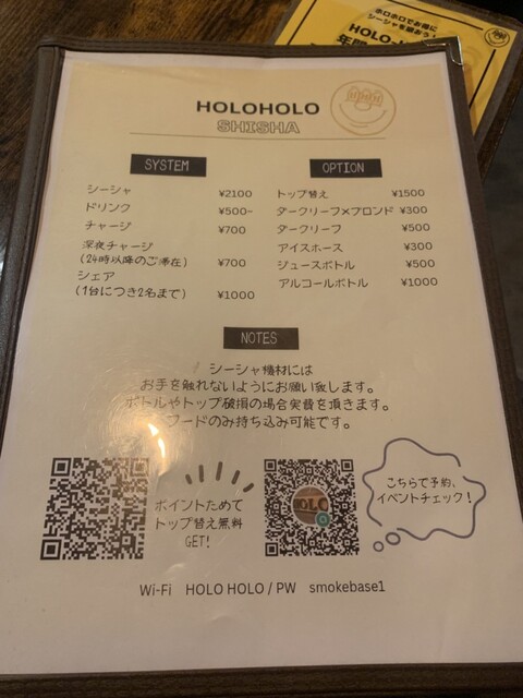 価格帯は3000〜4000円ほどで、この満足度ならむしろお得だと思います。秘密基地みたいな空間で、肩肘張らずにゆるりと過ごせる「ホロホロシーシャ」。シーシャ好きはもちろん、ちょっと気分転換したい時にもぴったりのお店でした。また行きたいなぁという余韻がしっかり残る素敵なスポットです(^ω^)
