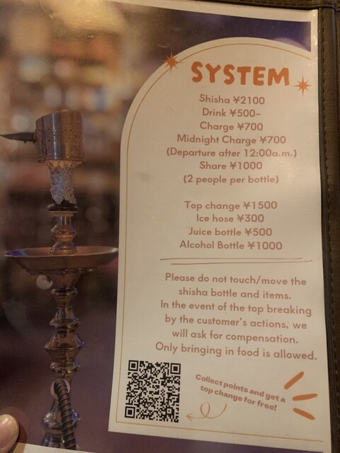 接客もかなりフランクで、スタッフさんがとにかく話しやすいのが印象的。初めての人でも緊張しないだろうなぁと感じましたし、気になるフレーバーの相談にも丁寧に乗ってくれました(^ω^) シーシャって奥深い世界なので、こういう“ノリよく親切”な接客は本当にありがたいです。