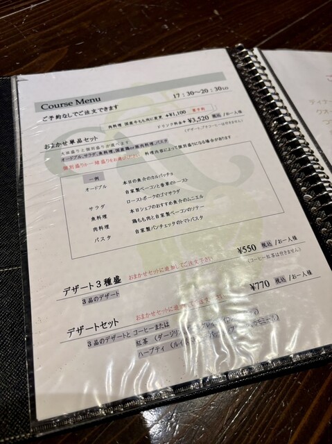 【前菜&サラダ・スープ・本日の一品(魚料理)・パスタ(2種より選べます)・デザート・ドリンク】