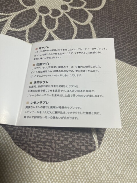 缶の中には、苺サブレ、和栗サブレ、抹茶サブレ、レモンサブレの4種類のクッキーが詰められています。それぞれ個性豊かな味わいで、特に和栗サブレが私の好みに合いました。