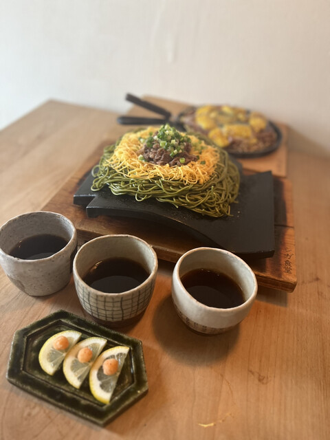 熱々の瓦の上には、パリッと香ばしい西尾産抹茶そばと綿糸卵とお肉が乗ってます!
