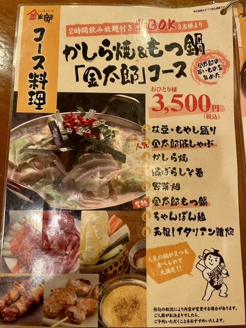 2時間飲み放題付きで、看板鍋+肉・串焼きなどが入る全9品コースで約3,500円(税込)というプランあり