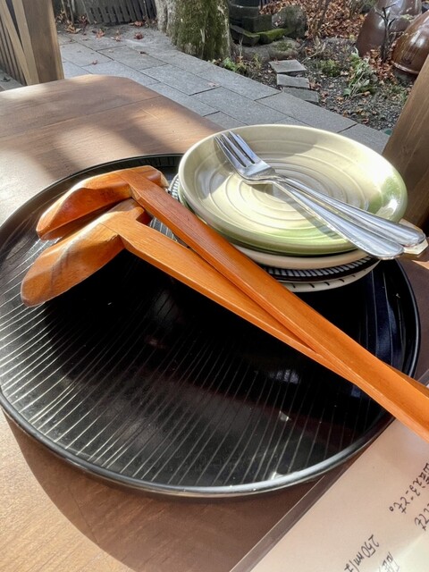 店内にも県境の線があり、山里の古民家的雰囲気で木材を基調として、素朴で温かみのある空間。薪ストーブも素敵でした。