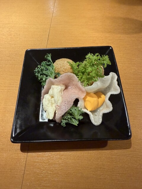 新鮮な鯛のお刺身に自家製ラー油とカシューナッツを