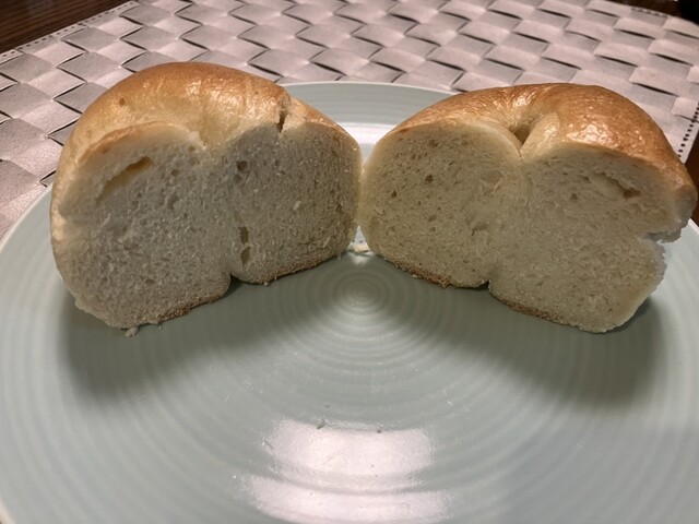 最後はこちら。プレーンを食べるとそのお店のこだわりや特徴をダイレクトに感じることが出来るので最近は必ず購入しています。断面を見てみると、他のお店よりもかなり分厚いです!生地を見てもみっちりハード系だとわかります〜!早速頂きます。表面はザクッと、中はむっちりもっちりとしていて美味しいです!すっと歯は通るのに中々飲み込む大きさにならない不思議な感覚…!噛めば噛むほどもっちりとした生地の感覚があります。一口分だけはちみつをかけたりもしたのですが、やはりプレーンはプレーンの状態で頂くのが1番だと思います!何かを足してしまうと食感は残るのですがプレーン特有の小麦の味が失われてしまうんですよね。少しパサついたのが気になりましたが(冷凍焼けしてしまったのかもしれません…)プレーンとして美味しく頂けるベーグルでした!