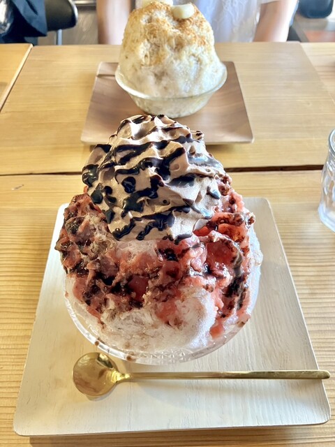 皆で別々の味を頼んでシェアしたのですが、自分はこちらを注文しました!他のお客さんに提供されている物を見て、これが1番美味しそうだったんですよね(*^^*)果肉入りのいちごソースの上にチョコ味のソースとホイップクリームがトッピングされています!溶けてなくならない前に急いで頂きます。ふわっとした氷にほど甘い、程良く酸味があるいちごソースが相まってとっても美味しいです!!甘めのいちごソース、チョコソースとクリームの組み合わせで甘党の私には嬉しい味です〜いちごの粒がアクセントになり、たっぷり量があっても飽きがこないです。チョコレートは王道のミルクチョコレート味です。ふわっとした氷とぽってりとした甘い味のチョコホイップが対照的で喧嘩するかと思いきや、混ざるとフラペチーノのような味わいになって贅沢な気分でした!中にもチョコホイップクリームが入っていたので、上のトッピングを気にせずに食べられる所も良いなと思いました!