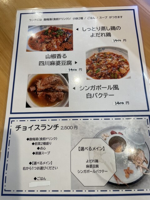 今日は大丈夫!私の目の前を綺麗な女性が階段を上がり入店します。これだけでもテンションアップ! カウンター席に案内され、最初から心に決めていたチョイスランチをチョイス。麻婆豆腐を選びます。待っていると「酸梅湯をどうぞ」とのことでそれを飲みます。確かに酸っぱいけれどむせるような酸味ではない。ザクロのような酸味を感じたのだが、それはハイビスカスではないか?とのお店の方のコメント。もう、この時点でお店の深さが予想できます。