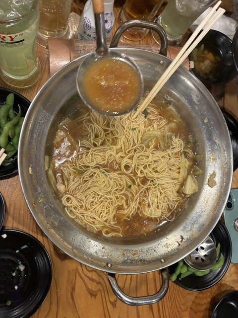 サラダ、シメサバ、お鍋のきりたんぽを美味しく頂き、続く枝豆やポテトは爆盛り!鶏皮の焼き鳥にシメのラーメンと雪見だいふくのデザートでかなりお腹いっぱいになりました。