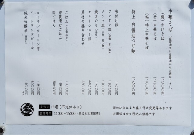 土曜日の開店と同時に行ったけど、並んで結構待った。日差しが強かったけど、傘を貸してくれるのは嬉しい。松特上中華そば(税込1,600円)の白醤油を選択。この松特上がいわゆる全部盛りのこと。