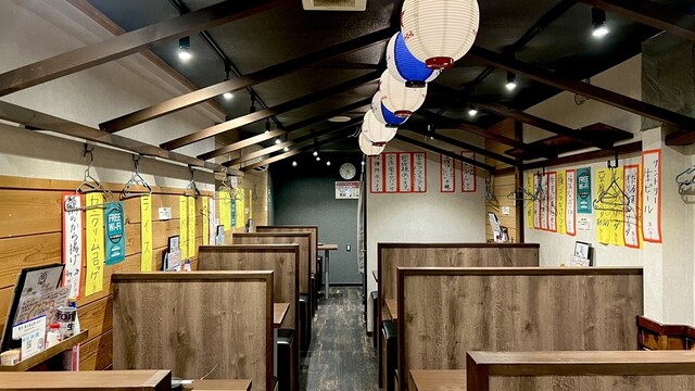 焼き鳥もつ鍋だるま 石神井町公園店は、この可愛らしい建物が2階建て。正面からはこじんまりとした居心地の良い空間に見えますが、店内に入ると奥まで驚くほど広々とした空間が広がっています。