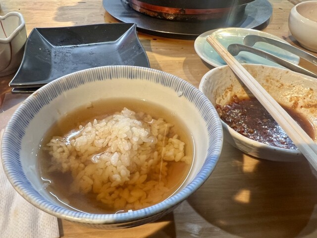 勿論、ご飯も普通サイズでパクパクいただくのですが、こちらのシメはご飯にお茶をかけていただいて、使っていたジンギスカンのタレをそこにかけて、お茶漬けとして食すのです!