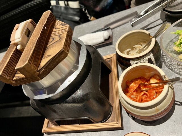 まず、最初に前菜としてキムチともやしのナムルの後、牛タンの釜飯が運ばれてきて、店員さんが火をつけ、タイマーを30分でセットしてくれます。