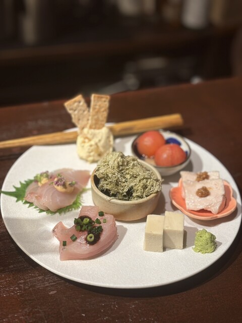 お通しとして1皿、前菜盛り合わせのようなものが出てくるのでそれをつまみながらメニューを見るのが楽しい!