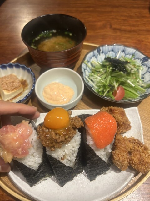 漬物、唐揚げ、豆富(小鉢)、味噌汁、水菜サラダ 唐揚げ2個(おにぎり:明太子ディップ、卵黄そぼろ、とろたく)