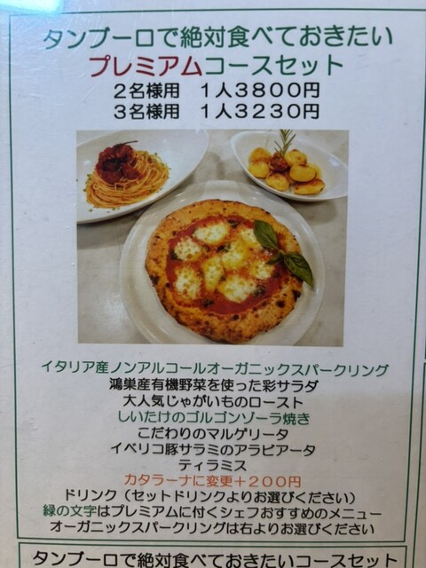 行ってみたいと言われた後輩を連れて、3名で予約しました。いろいろ食べたいけれど、やはり「タンブーロで絶対食べておきたい」とメニューにあるように、プレミアムコース!!