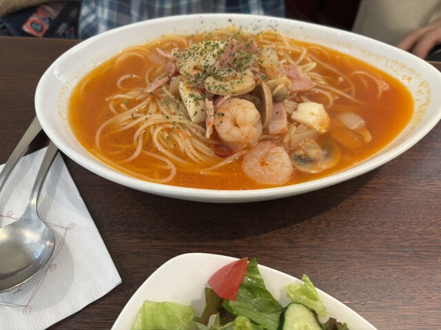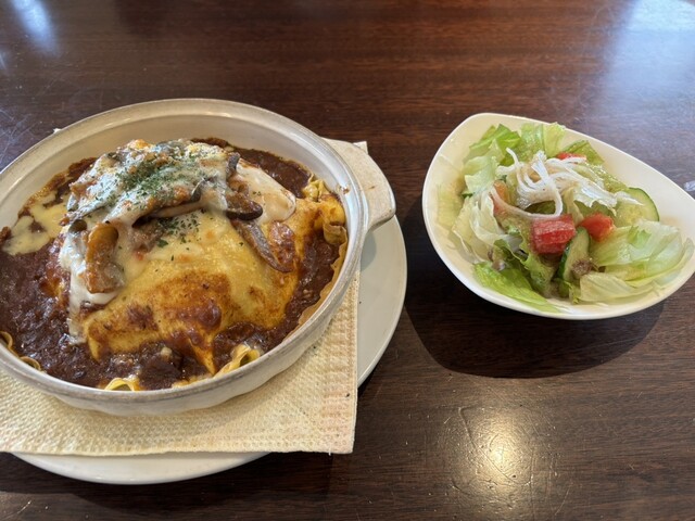 今回私は「チキンのチーズ焼き」、仲良しの一人は「ナスと木の子のミートオムライス」、もう一人は「魚介のピリ辛トマト、スープ風」。ライスやサラダ、ドリンクが付いて1500円以下というのは嬉しいです。どれも美味しくてボリュームもあり、男性客も多いのが納得できます。