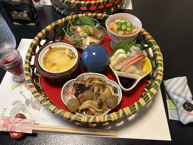 籠盛りの杏花膳(生ハムといちじくのサラダ、蓮根のすり身の中にはエビ、お造り、サーモンロールの中にはおから、鯖とキノコのグラタン、めかぶ)