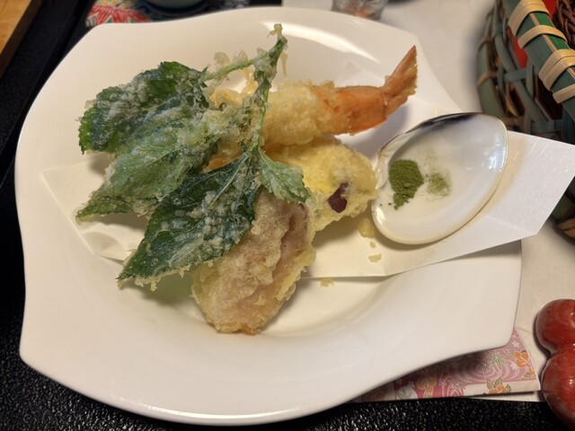 天ぷら(蓮根のはさみ揚げ、エビ、山芋をすって挟んだ大葉、柿)牡蠣ではなく柿です!