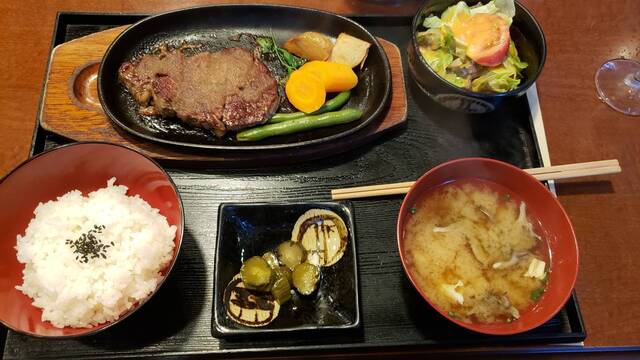ステーキ膳はご飯がつくメニューの中ではお手頃価格でしたが、サラダなども付いて、ステーキもしっかり美味しいステーキでお得感がありました。夫が頼んだハンバーグも美味。しっかり肉汁が溢れるハンバーグに目の前でソースをかけてくれます。