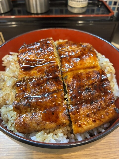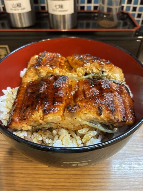 香ばしく焼き上げられたうなぎが丼いっぱいに二枚、見た目からテンションが上がります。