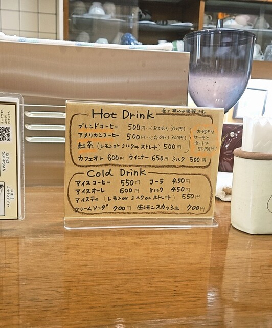 カウンター席に座りメニューを見るとケーキとドリンク頼むと50円引き!!