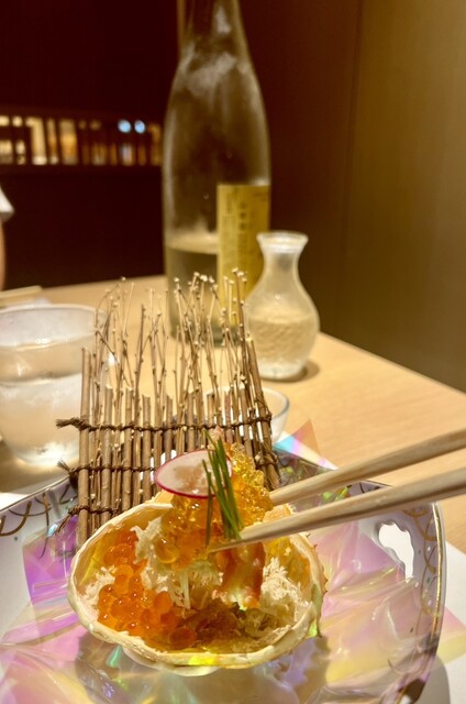 中盤に登場するズワイガニ甲羅盛りは、このコースの名物ともいえる一皿です。