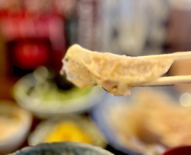 肝心の餃子ですが羽と皮はこんがりとパリッパリに香ばしく焼かれ、噛むとじゅわっと肉汁と野菜の甘みが広がります。