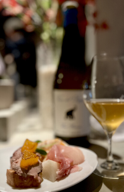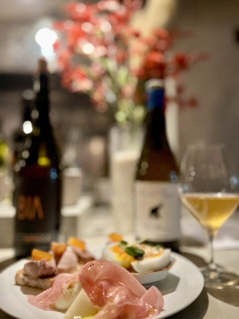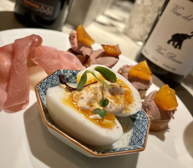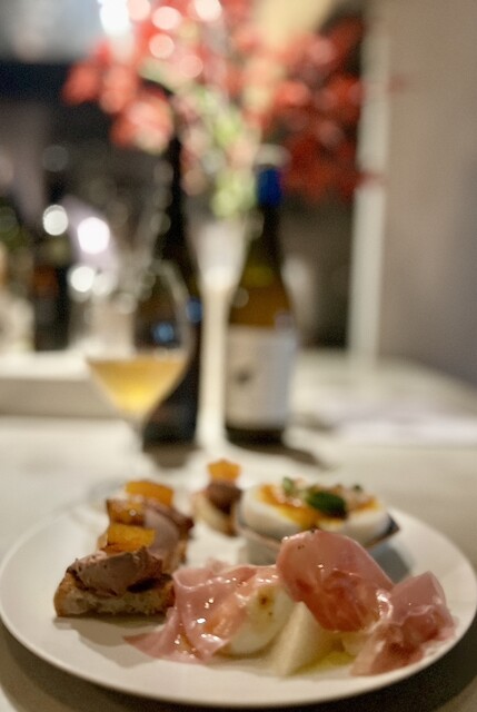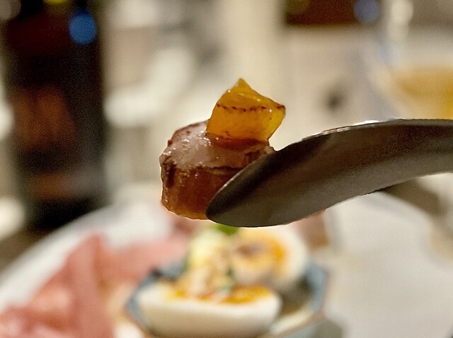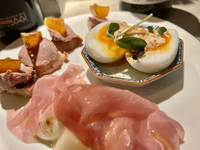 どれもまさに衝撃的な美味しさで、丁寧な仕込みがひと口ごとに伝わってきます。特にモッツァレラブリュレは、こんがりとキャラメリゼされた香ばしさとミルキーさのコントラストが絶妙。この日のフルーツは千葉県産の梨で、ジューシーな甘さと生ハムの塩気が重なり合い、思わずうっとりしてしまうバランス。レバパテもコク深く、ウフマコは滑らかな仕上がりで、全てが主役級の一皿でした。