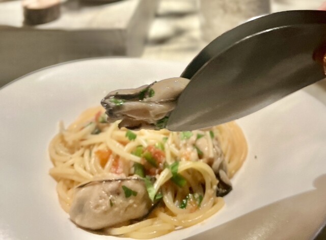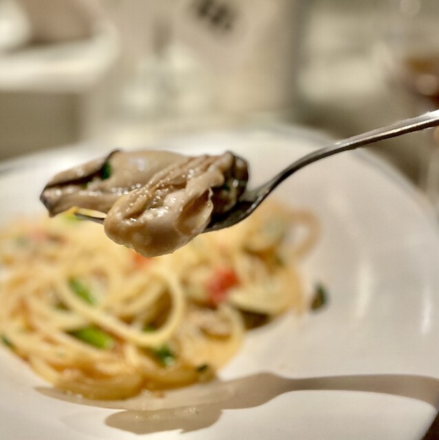 そしてパスタは種類が豊富で迷いましたが、今回は 大黒神島産カキとニンニクの芽のカルティエーラ スパゲッティ を選択。まず目に飛び込んでくるのは、大ぶりの牡蠣がいくつも豪快にのったビジュアル。その存在感に思わず声が出るほど。ひと口食べると、もちもちとしたアルデンテのパスタに牡蠣の旨味がしっかり絡み、にんにくの芽の香りが全体を引き締めてくれる絶妙なバランス。濃厚すぎず軽すぎず、絶妙な火入れでレア感を残した牡蠣のぷりっとした食感が贅沢で、まさに“気を失う美味しさ”でした。