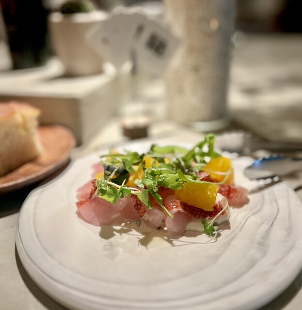 まずは 金目鯛のカルパッチョ ロースト昆布のオイル〜オレンジとのカルパッチョを。