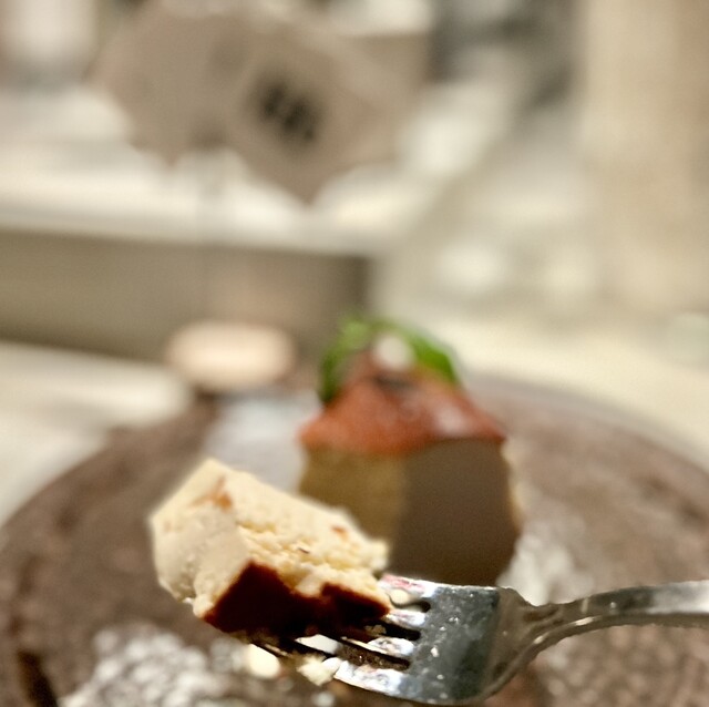そして最後のデザートには バスクチーズケーキ を。冷蔵庫から丸いホール状のバスクチーズケーキをシェフがカットしている瞬間を見てしまい、期待が一気に高まる。食べてみると、そのなめらかさがもう尋常ではなく、口に入れた瞬間に溶けていくようなクリーミーさ。甘さのバランスも絶妙で、これまで食べてきたバスクチーズケーキの中でもダントツの“過去一”。