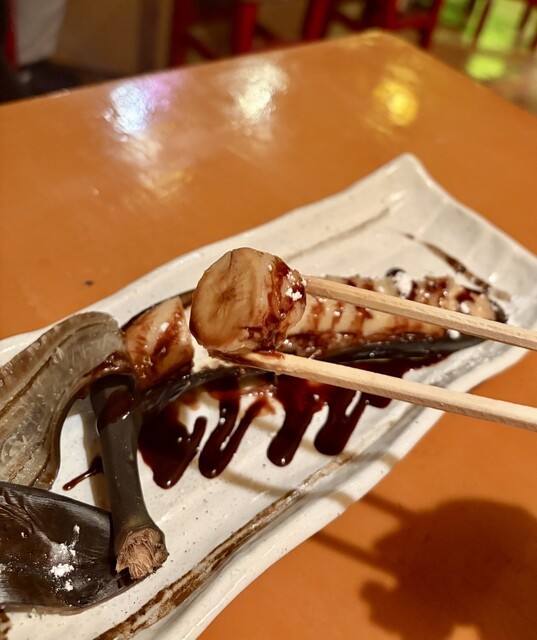 たっぷりのチョコレートがかかっていて、どこか懐かしい味わい。炭火で温められたとろっとしたバナナの甘さとチョコのコクが合わさり、ほっとする締めくくりでした。