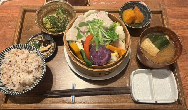 蒸籠蒸しランチにワクワク。ご飯は五穀米をチョイス、お野菜モリモリランチに大興奮。ポン酢か塩かで食べます。蒸籠で蒸すとお野菜たちはこんなに甘くなるんですね。化学調味料を使ってないようなお味噌汁もおいしかったです。芦屋という立地も良く大満足でした。ご馳走様でした。