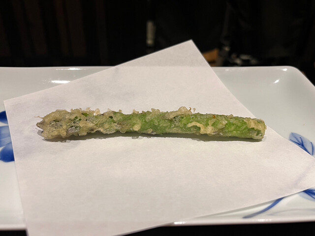 ウニとアスパラを大葉で包んだ天ぷらは贅沢すぎる!
