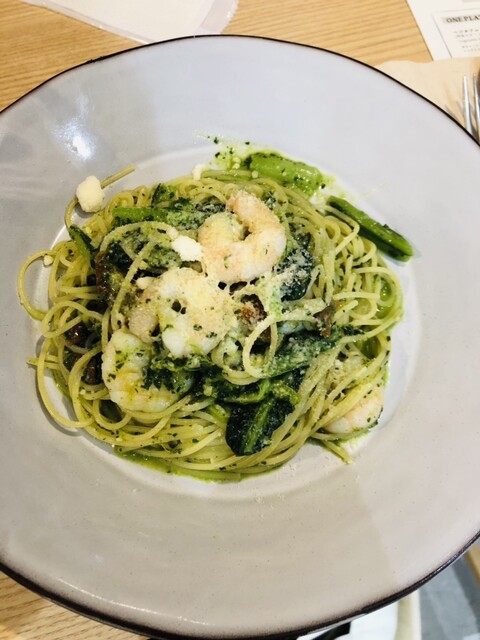 ぷりぷりのエビと、小松菜とソースの相性がバッチリ!量も程よいです。建物が出来てから落ち着いてきたのか、平日なら予約なしでも行けそうです。