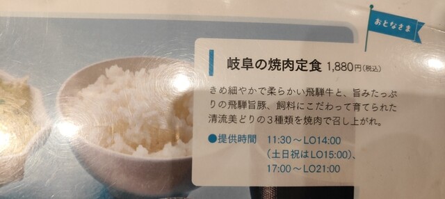 期間限定と思われる岐阜の焼肉定食1880円を頂きました。全て肉厚な飛騨牛、豚、鶏肉に焼き野菜や松茸までのなかなか豪華な内容。暑い中、駅まで自転車で移動したのでビールと焼き肉が旨いこと。