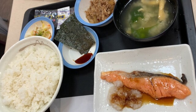 Wで選べる卵かけごはん350円は生卵と牛皿、紅しょうがをごはんに載せていただきました。安くて美味しい〜紅しょうが生卵に合う〜。油揚げとわかめのお味噌汁も美味しかった。連れは“炙り”焼鮭朝定食700円ごはん特盛です。また行きます!