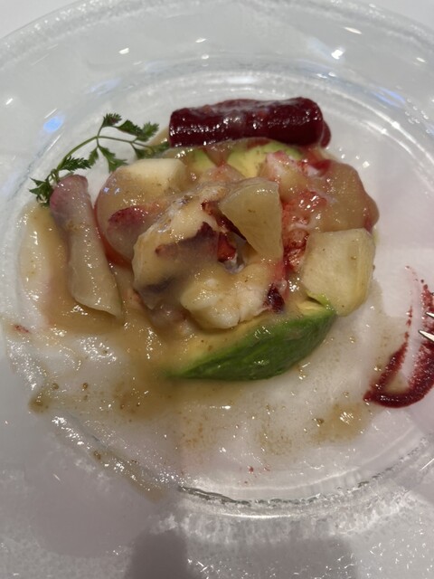 質は間違いないです、サーモンやサラダのなしなどからも感じられます。オーマル海老の食感はそんなに良いではないですが、ソースはすっきりして飽きない、その時あんまり食欲がない自分にとって素敵な前菜です