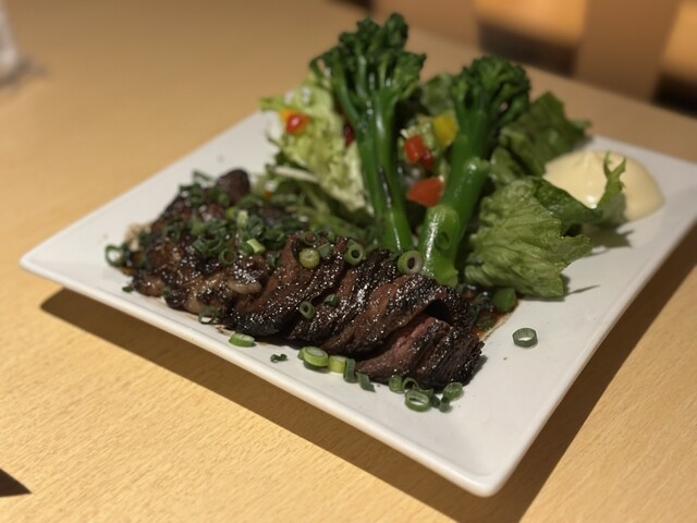 そして牛ハラミステーキ。こちらもあっさりポン酢仕立てで、肉の旨味をしっかり感じられる。焼き加減が絶妙で、噛むたびに肉汁がじゅわっと広がる。