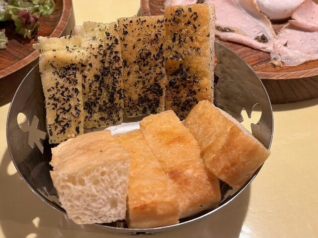 前菜とともに自家製フォカッチャがきます。ちなみにフォカッチャのコンテナが20代の頃にお給料をつぎ込んでいたイタリアブランドALESSIのものであったので、懐かしくて嬉しかったです。フォカッチャはチーズとハーブ(と思いきやシソ?)の2種類です。美味しいのですが大きくて、オリーブオイルたっぷりのため、ピザが入らなくなることを懸念して抑え気味にいただきました。